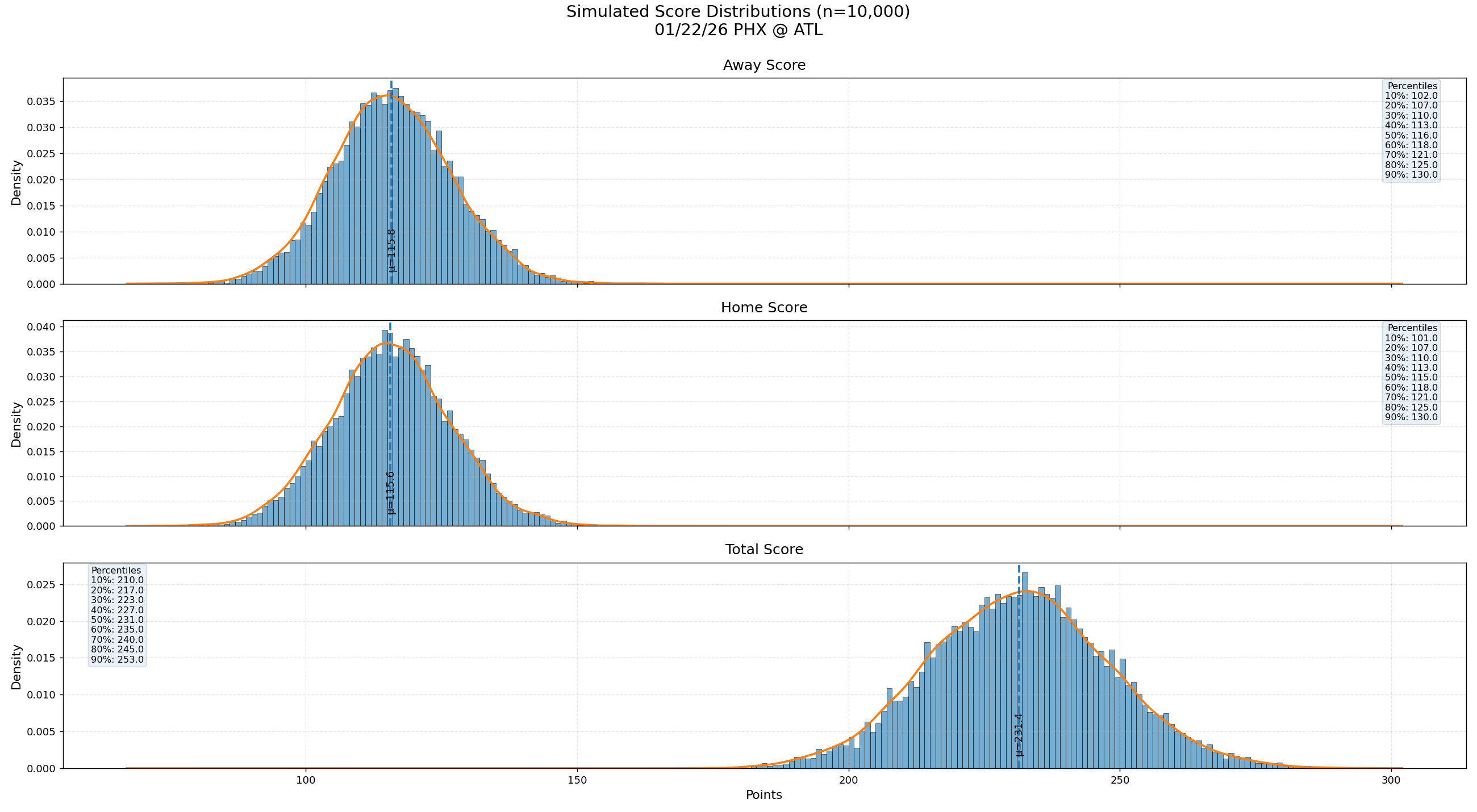 Predictions are generated from a possession-level simulation pipeline built from NBA play-by-play structure. The goal: realistic game scripts, not overfit box-score averages.